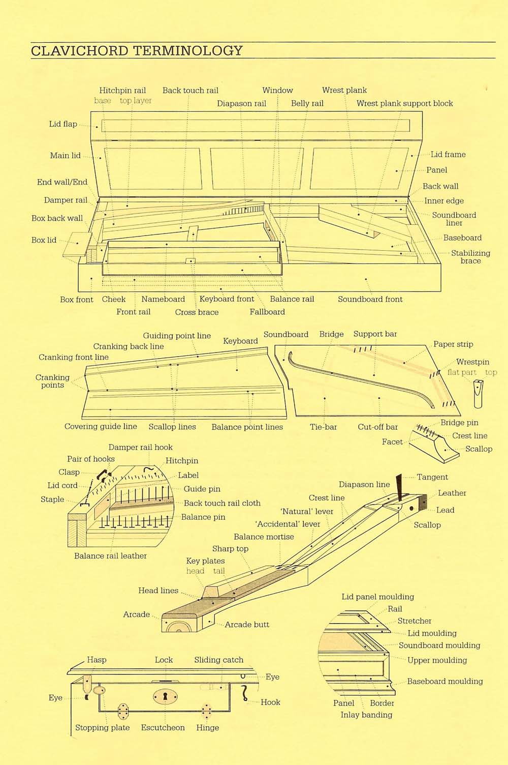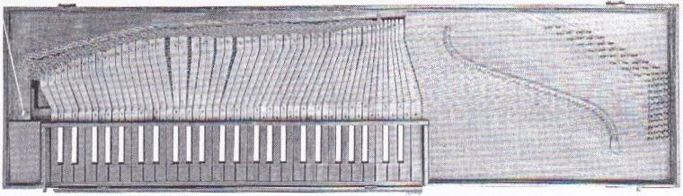 ●調律はヤング:この調律法はcからF,B,Eb,G#と純正5度で調律し、G#を合わせたことでフレッティングによって自動的に調律されたGからDを純正4度より少し広く(1秒間に0.65回のうなりが聞こえる程度にDを下げる)、次に今合わせたDからAを今度は純正5度より少し狭く(1秒間に0.7回うなりが聞こえる程度にAを下げる)調律します。調律の練習法と実際の手順は楽器が出来上がって納品するときに説明し、手順書をお渡しします。共有弦クラヴィコードではフレッティングの間隔(例えばcとc#の間の距離)をあらかじめ想定した調律法に基づいて決めておかなくてはなりません。やや難解かもしれませんがヤング調律の特徴に関しては僕のWebサイトに他の調律法との比較として載せてあります。